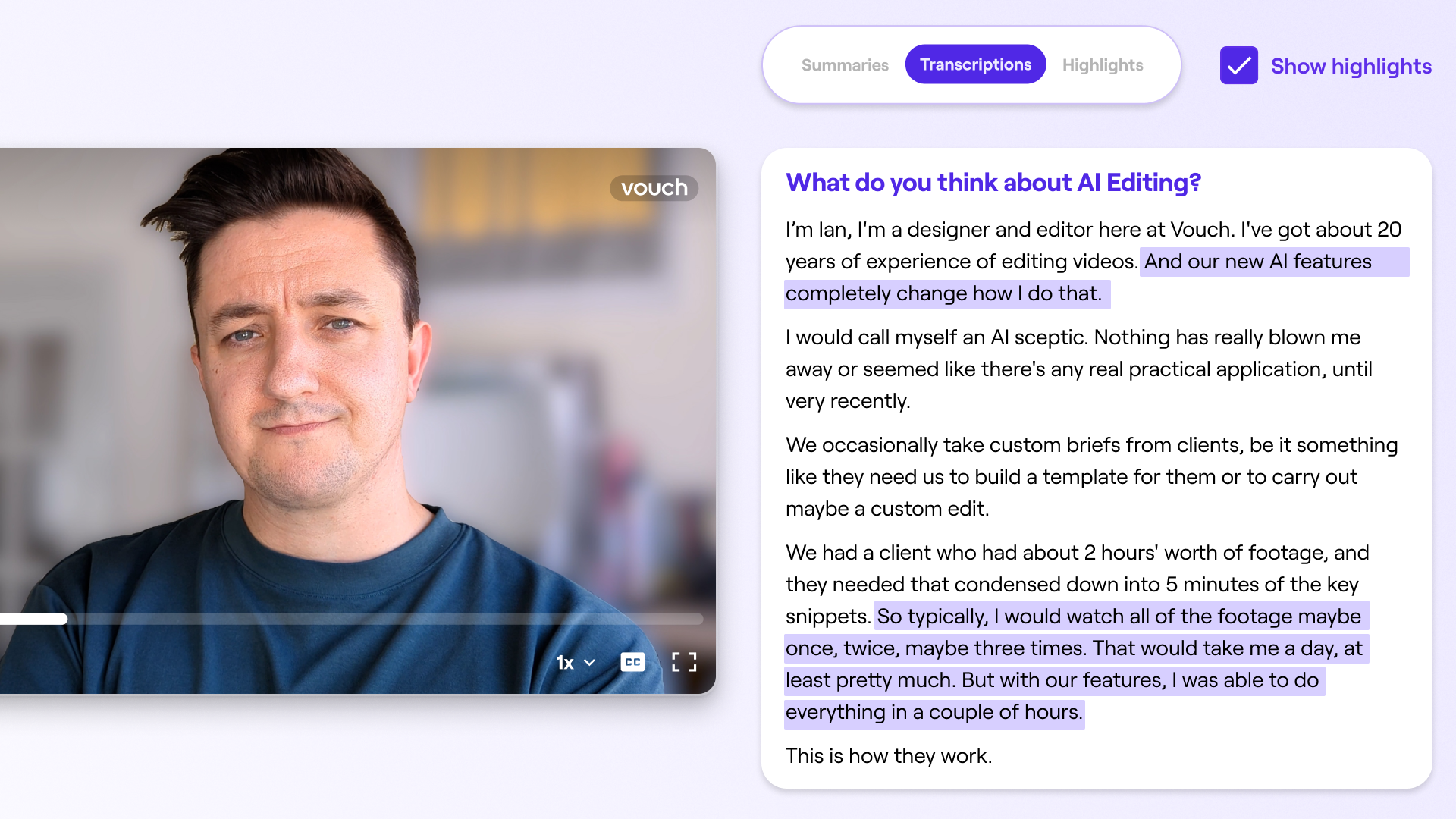 Ian is a designer and video editor here at Vouch. Safe to say, he was sceptical of our new AI editing features. Hear what he has to say after using them on his latest project below.