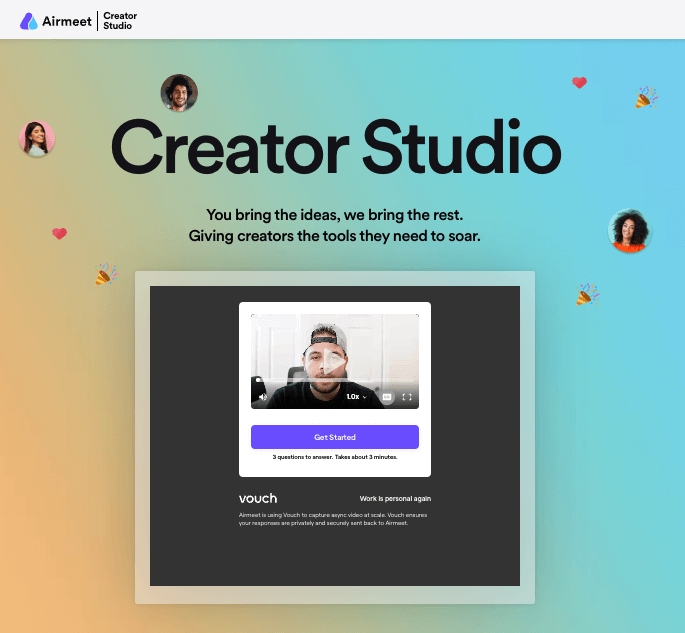 The Vouch recorder can be embedded into your website so you can collect videos right there and then. Airmeet used an inline recorder to collect video submissions for their Creator Studio initiative. Creators could get the context they needed by watching the cover video, view the questions and record their response, without ever leaving their website.