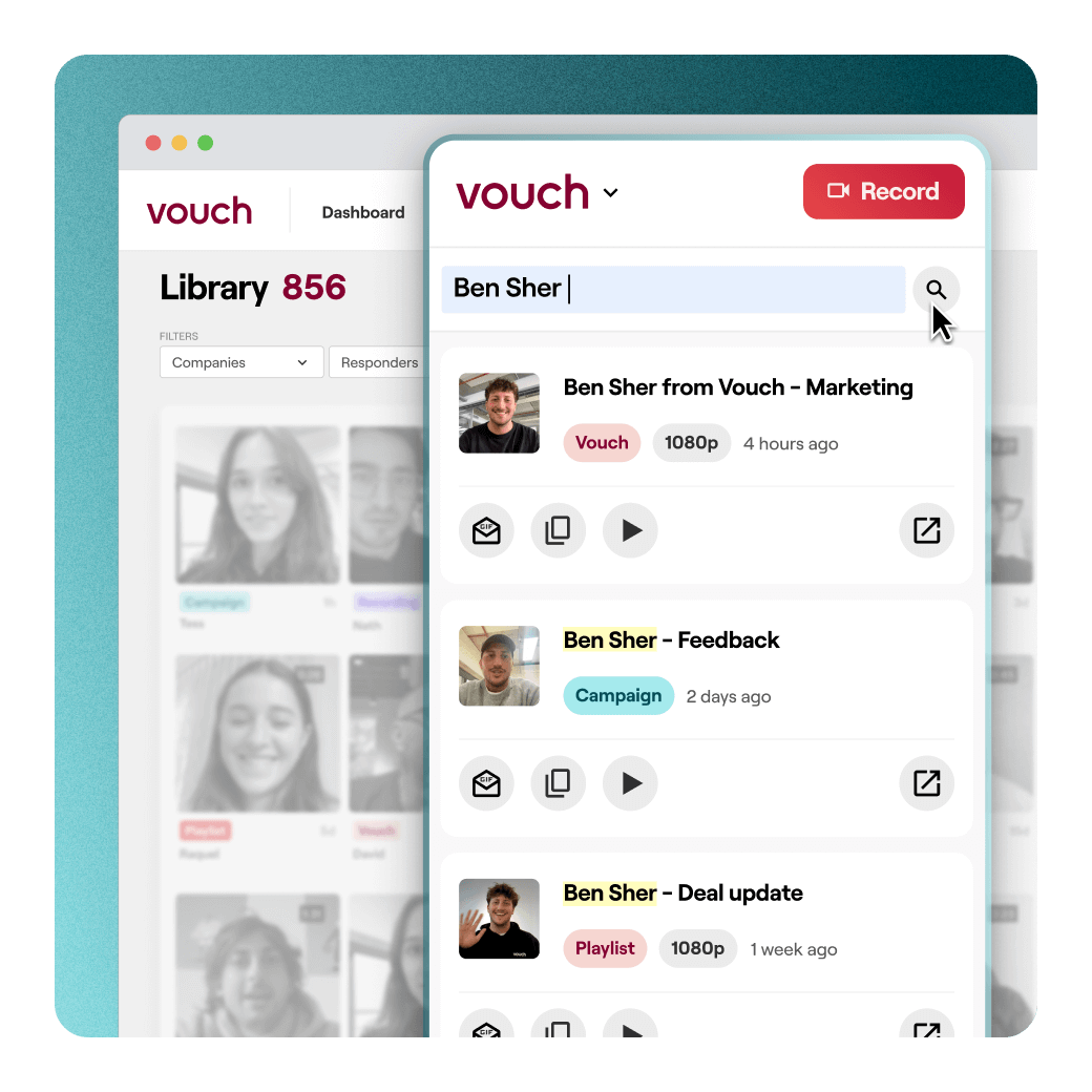 Hit search from your browser tab and access your entire Vouch video library seamlessly. Let AI do the heavy lifting with keyword search that finds what you need fast.