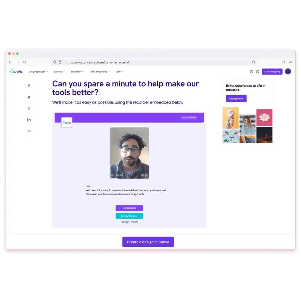 Integrate with Canva to drop your UGC video straight into social media or presentation templates, or embed directly onto your website, check-out flow or email comms. Vouch is made for sharing.