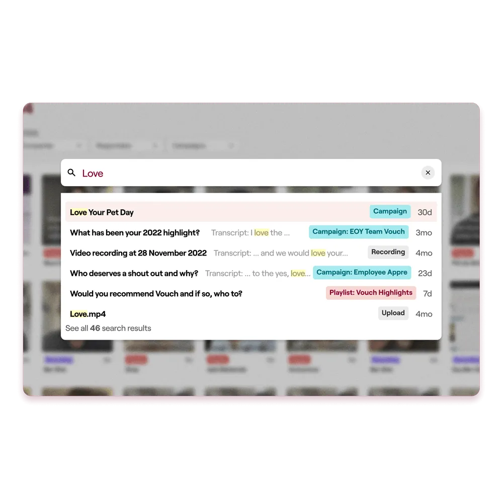 Keep your video testimonials, customer feedback and brand assets organized in one place, and easily find your assets by tag, keyword or customer name.